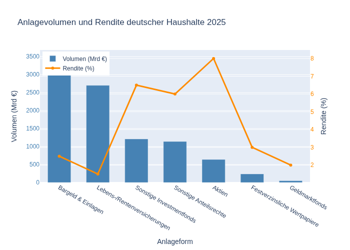 👉 Bargeld & Einlagen dominieren mit 3,5 Billionen €, bringen aber nur ~2,5 % Rendite.